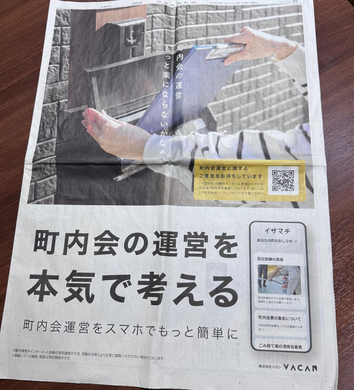 町内会・自治会の運営業務をDXするためのSaaSプラットフォームのニーズ検証と実証協力先を募るため、日経新聞15段広告を掲載しました。かなりの反響を全国の町内会から頂いております!