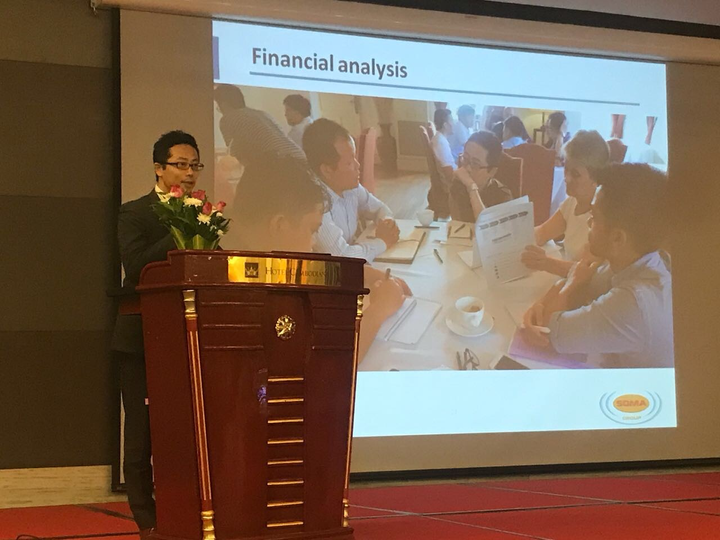 カンボジアにてココナッツオイルを活用した新規事業計画を説明