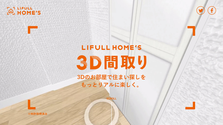 LIFULL HOME’Sに掲載されている賃貸物件の間取りをプロシージャルに3Dオブジェクト化し、3D空間上で確認できるウェブサービスです。LIFULL AI戦略室様より提供いただいた座標データを3D化しています。そのフロントエンド全般の開発を担当しました。UIにはVue-CLIを、WebGLにはthree.jsをそれぞれ用いています。座標配列ごとに内壁、外壁、ドア、窓のオブジェクトを分割して生成する、プロシージャルながらオブジェクトの質感を維持する方法などを工夫しました。