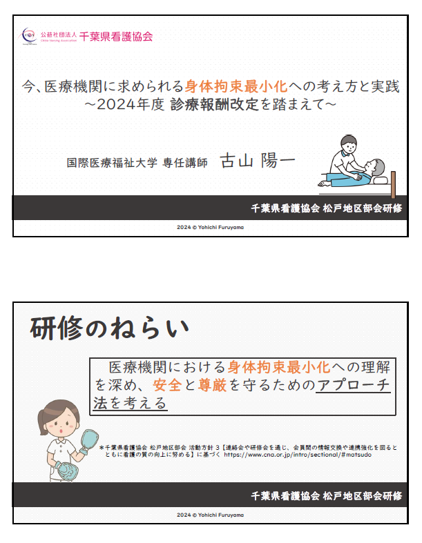 千葉県看護協会の地区部会研修にて、「診療報酬改定と身体拘束最小化」をテーマにした研修を実施しました。