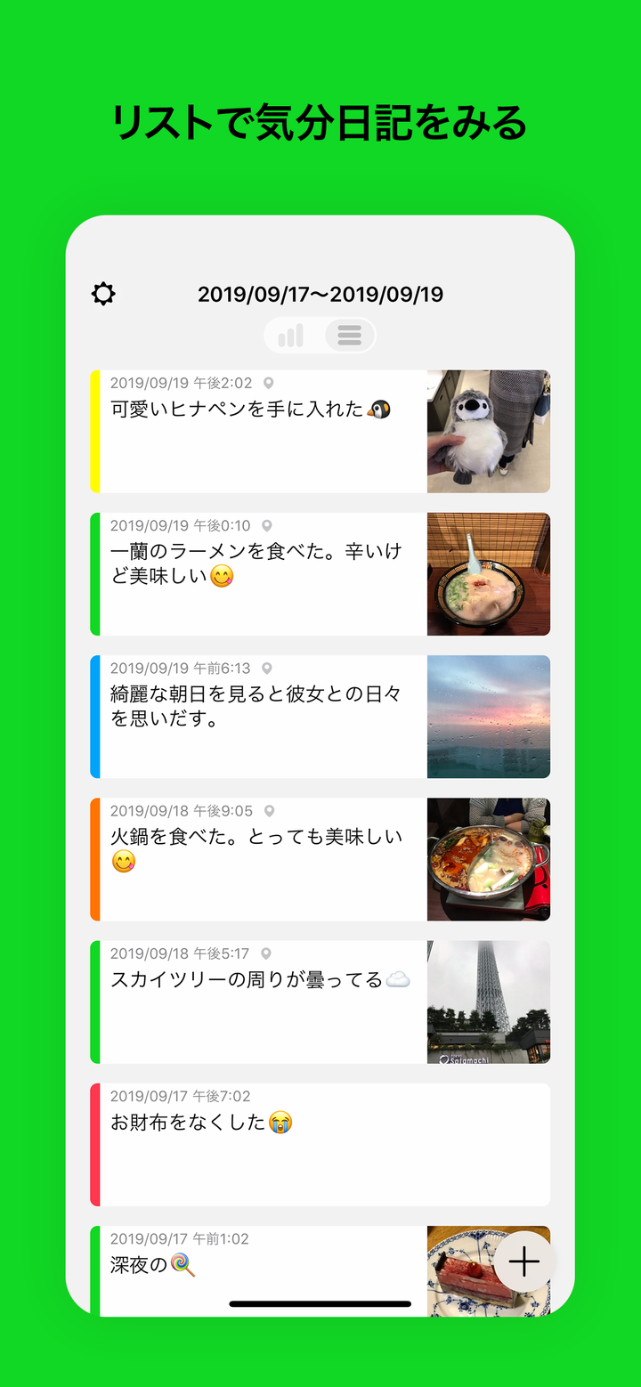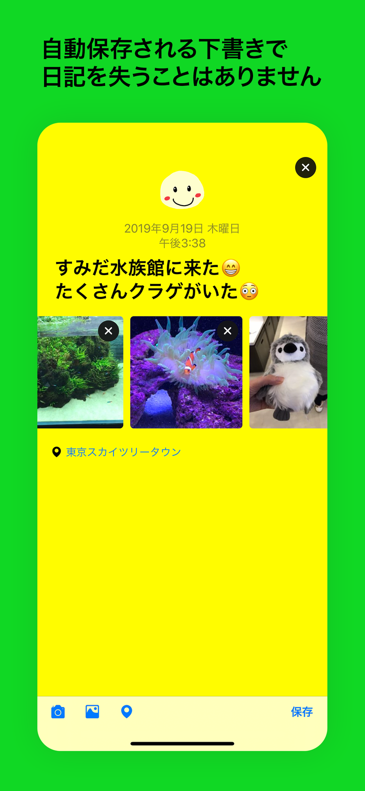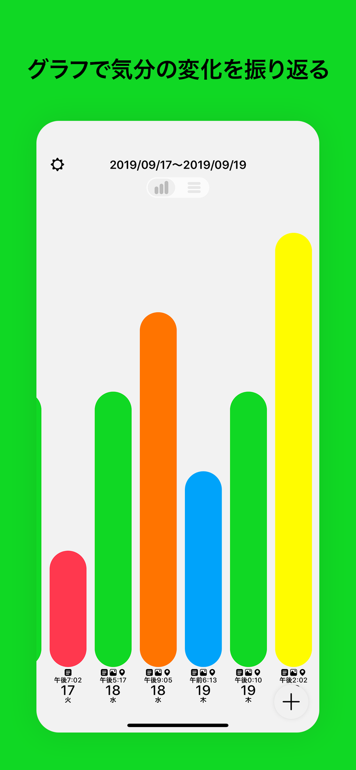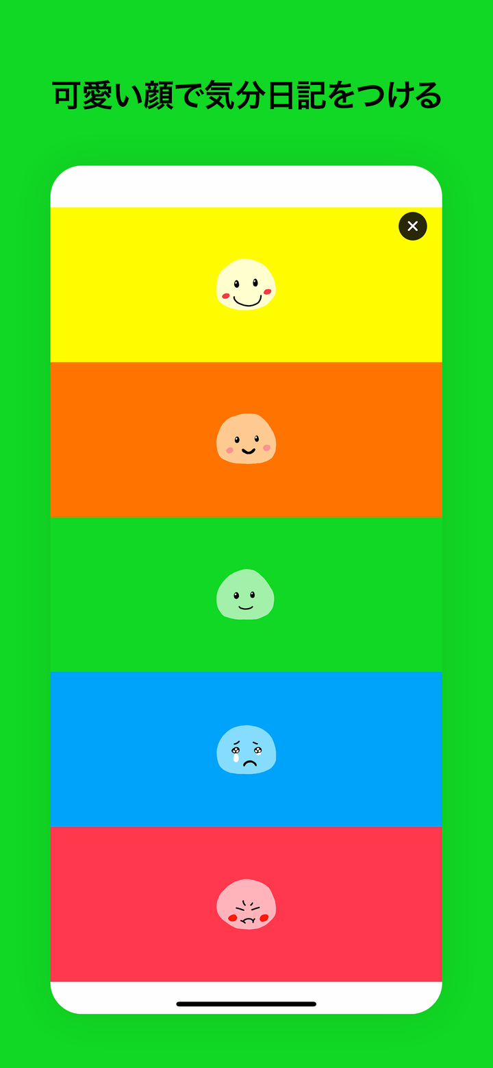 Mood は可愛い顔の気分を選んで日記を書く iPhone 向けのアプリです。 日記にはメモ、写真、動画、場所を記録することができます。 記録した日記をリストや気分の移り変わりが一目でわかるグラフで見ることができます。 大切な日記を iCloud で安全にバックアップと同期をすることもできます。