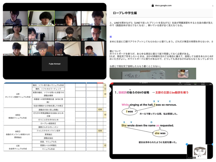 緊急事態宣言が出て、塾も休業要請の対象となりました。その中で講師全員とzoomをつなぎ、オンライン授業のロープレ、体制づくりに挑戦しました。私は、ロープレをしノウハウをまとめる役割と生徒や保護者に配るマニュアルを作成する役割を担当しました。授業を止めないために1週間という期限の中で試行錯誤を繰り返しました。不安げな様子でzoomをつないでいた生徒が分かりやすかったですと話してくれた時は非常に嬉しかったです。