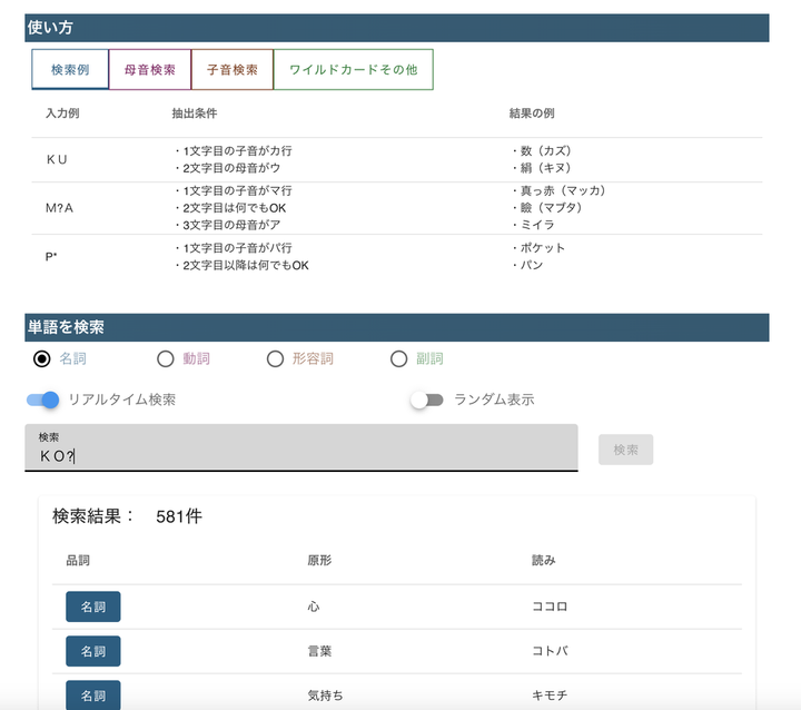 母音・子音、ワイルドカードを柔軟に組み合わせて、品詞別に検索できる単語DBのWebサービスをリリース。誰もが「音」を起点として無数の日本語に出会い、言葉との親しみを深められる機会を提供しています。