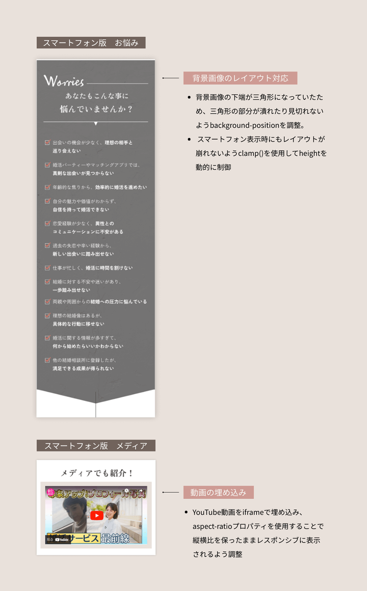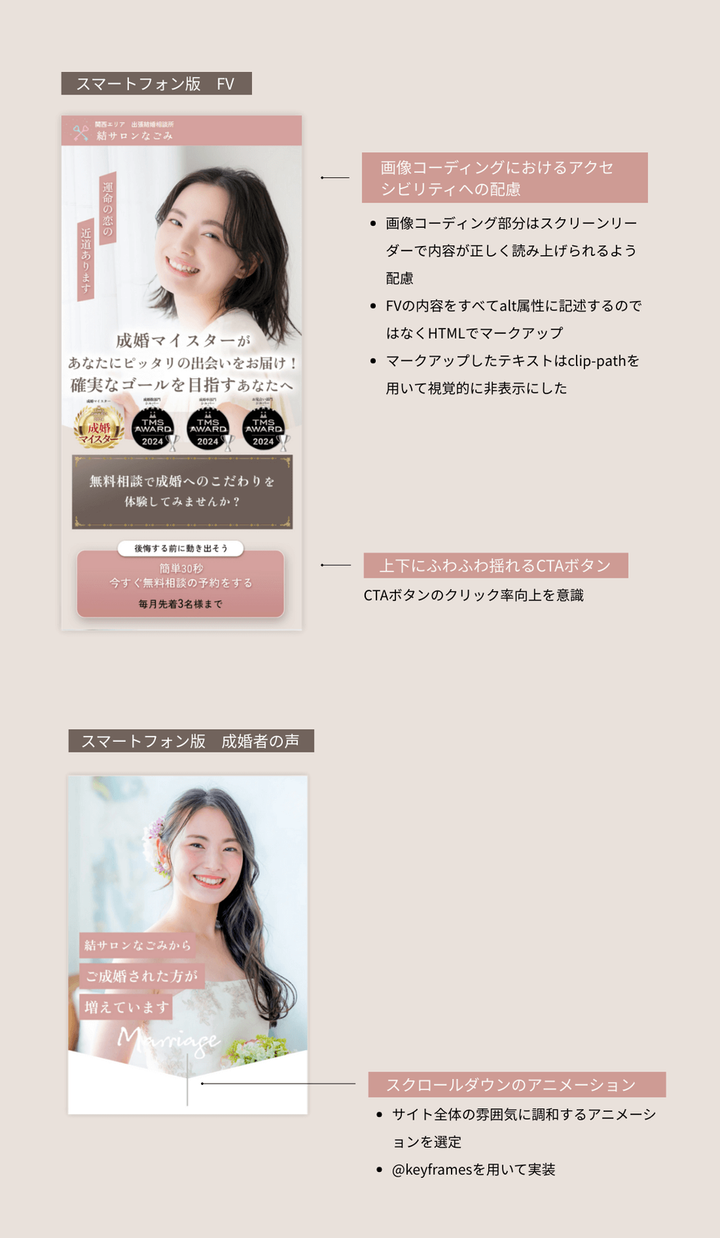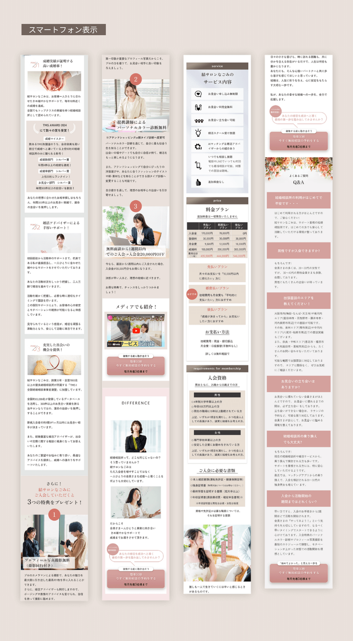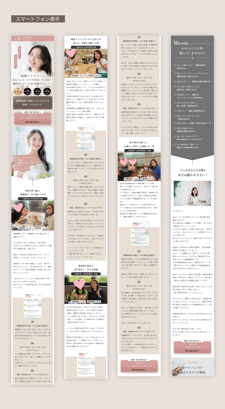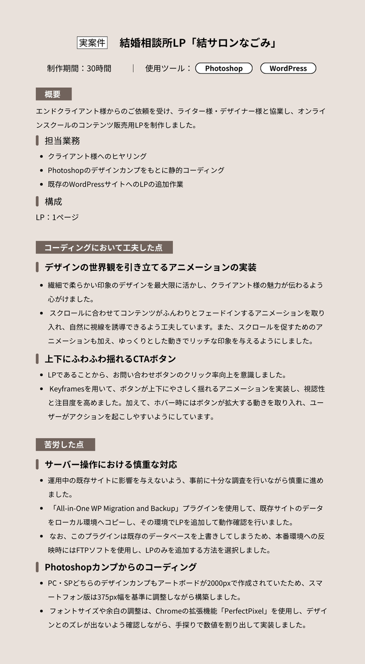 【クライアント】 オフィス和様 【担当範囲】 ・クライアント様へのヒヤリング ・静的コーディング ・既存のWordPressサイトへのLPの追加作業 【制作時間】 30時間 【概要】 エンドクライアント様からのご依頼を受け、ライター様・デザイナー様と協業し、 結婚相談所のLPを制作しました。