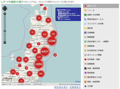 東日本大震災においてTwitter上から救助要請と思われるツイートを収集して地図上にマッピングするシステムの開発。