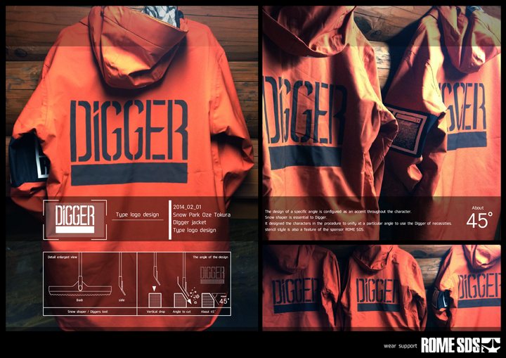 ロゴの随所に特定の角度がアクセントとして構成されたデザインです。 その角度はディガーには必須のレイキ(スノーシェイパー)という道具を垂直に雪に落とし込んで削ると自然と出来る角度です。 それをDIGGERという文字に特徴付けてデザインすることで、意匠に意味合いを絡めています。 ステンシルスタイルにしているのは、スポンサーであるROME SDS のブランドイメージでもあります。 一見シンプルで普通の文字ですが、ディガーが使う道具で文字を彫刻するという擬似表現で、ロゴそのものが整備されたスノーパークを体現しています。