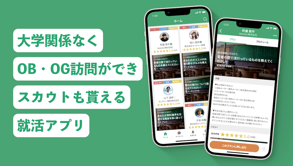 大学3年から就活支援を続けています!今まで1500人ぐらいと面談、大手からベンチャーまで内定実績あり ※主な学生内定先実績 電通、博報堂、野村証券、住友商事、丸紅、NHK、ロレアル、リクルートホールディングス、リクルート住まいカンパニー、リクルートライフスタイル、リクルートキャリア、リクルートコミュニケーションズ、DeNA、出版社、ファーストリティリング、京都銀行、GU、八木通商、三菱商事ファッション、USEN、エムスリー、ビズリーチ、明治安田生命、楽天、サイバーエージェント、アイスタイル、アビームコンサルティング、大手金融機関(UFJ、三菱ケミカル、JACリクルートメント、三井住友銀行、地方銀行など)、マスコミ、外資系コンサルティング企業、国内大手メーカー、財閥系不動産、官公庁、難関ITベンチャー企業、スタートアップ企業など