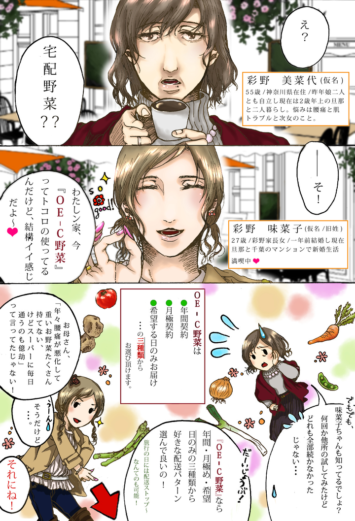 漫画LPの見本です。 WEBデザイン系の職業訓練校に通っていた時代のAdobeIllustraterのランディングページ作成の課題で描いた架空の宅配野菜会社のPR漫画です。 学校から出された課題と自身で設定したペルソナとベネフィットに沿い、先ず登場キャラクターをペルソナに近い人物(50代主婦)と説明・物語誘導役の娘に設定、案を練り、構成・ネーム・ラフ・下書きまでを一晩で作成(アナログ作画)。 その後デジタル移行し色塗りに5時間程度です。