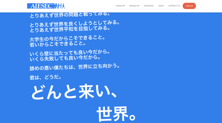 大学への新入生のため、弊団体の紹介及び、得られる経験の紹介を乗せたLP。 こちらのサイトは、新歓用に作っていたサイトで、25大学の広報ツールとして使用されました。 自分はこのサイトのデザイン、コーディングなど基本的には全てを担当しました。(写真や動画などは過去のものを転用しました。) 時間がなかったため、完成度は6割程度です。 本来はSNS等でバズらせるための施策、各大学にローカライズされたページに飛ばすUXなど色々考えていたのですが、実現しませんでした。
