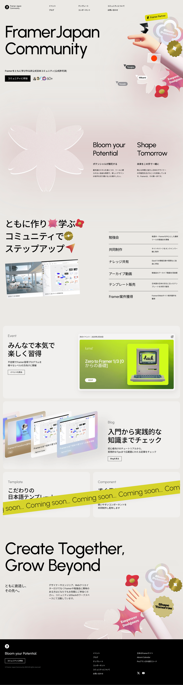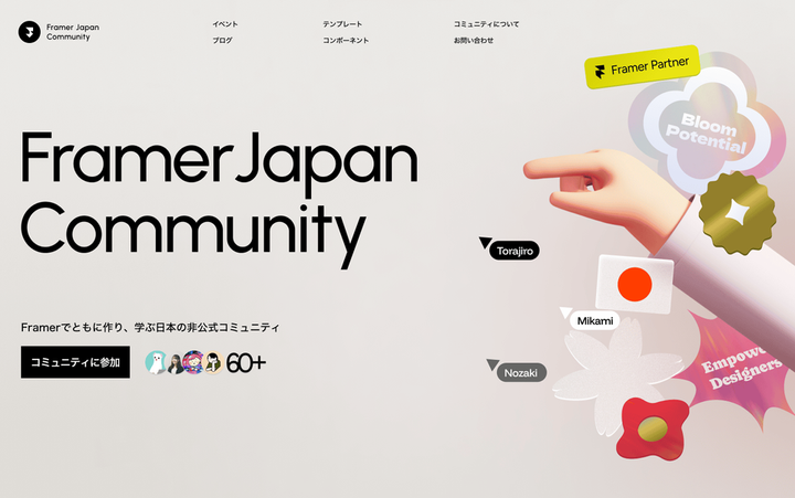主催しているFramer Japan CommunityのWebサイトをFigmaとFramerで作っています。 Framerは特にFigmaを使ったことのある人なら馴染みのあるUIで、運用もし安く設計されており、さらにコンポーネントなどネットワークを強化する機能もありノーコードツールの中で今の一押しツールです。日本語で学べるコンテンツが少ない、挫折しやすい現状があります。最先端のデザインスキルを日本人が身につけてより高い能力を発揮できる人を増やしたいと思っています。