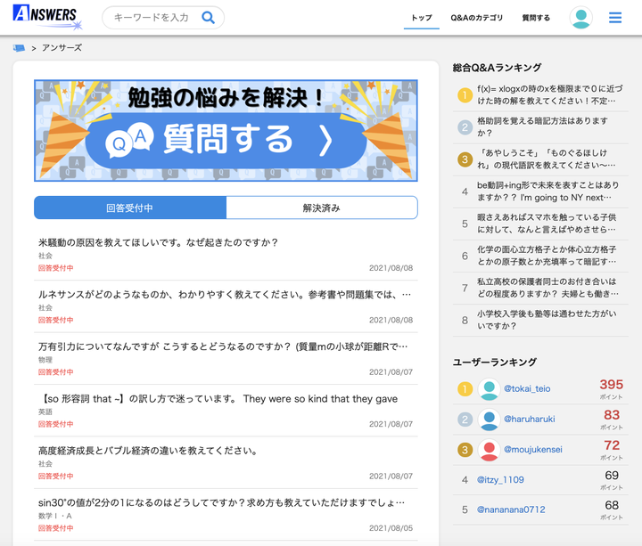 学生向けのQ&A掲示板 アンサーズをリリースしました! 学習掲示板として日本一の知名度を獲得できるよう頑張ります。