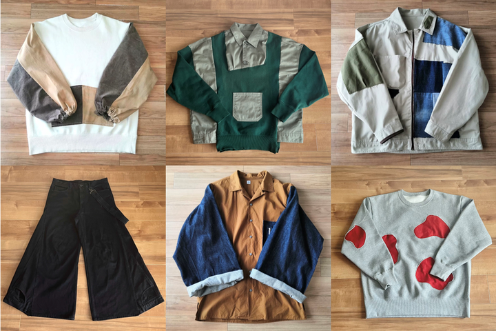 リメイク作品の一部です。主にスウェットやシャツといったトップスのリメイクを得意としています。最近では、ボトムスのリメイクや小物の制作もおこなっています。ワンピースやスカートといったウィメンズアイテムの制作にも取り組みたいと考えています。