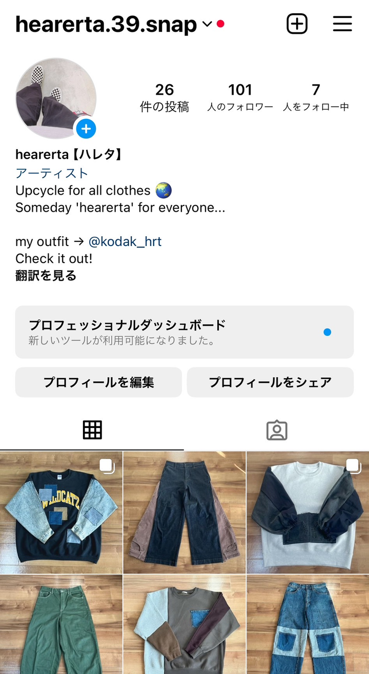 作品を掲載しているInstagramのアカウントの様子です。フォロワーの方に着ていただいたときは、アカウントをInstagramのストーリーにタグ付けしてもらうことで、宣伝していただいています。