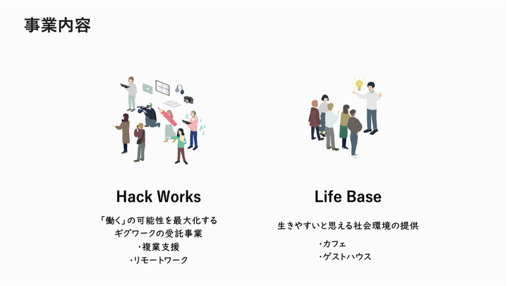 「働く」の可能性を最大化し、誰もが生きやすいと思える社会環境を整備 するために、拠店舗運営事業と複業支援事業をおこなっております。 カフェなどの店舗型ビジネス経験と、障がい者人材紹介などの就労支援ビジネス経験をもとに、休職離職中のビジネスマンを支援する事業を行なっています。