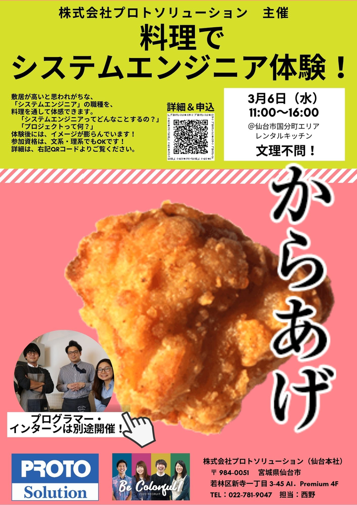 ・赴任後、現場のエンジニアと共に新卒向けのインターンシップのフレームを作った。 インターンの開催目的を、”採用”とおく企業は多い中、私たちは 「ITの楽しさを東北の学生に知ってもらう」という大義をブラさず企画。 そこに、ワクワクを追求する”私たちらしさ”をかけ合わせたら、満足度100%のインターンにまで仕上がった。 - '20卒向け「からあげインターンシップ」対面/レンタルキッチン - '20卒向け「1日でWebサイト構築するインターンシップ」対面/社内 - '21卒向け「5days 初学者向けAI開発インターンシップ」対面/社内 - '21卒向け「5days Webシステム開発インターンシップ」対面/社内 - '22卒向け「面接突破術!レゴで想像力とアドリブ力を 鍛える自己分析セミナー」オンライン - '22卒向け「デート上手は最高のSE。上流工程体験 1dayセミナー」オンライン