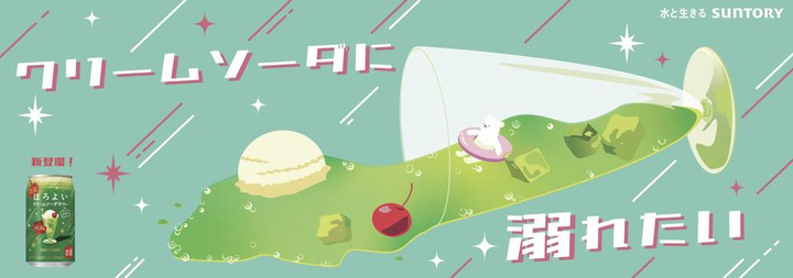 電車の中吊り広告を想定した課題作品 サントリーのほろよいを題材に、夏が苦手な大人にも「夏も悪くないかも」と思ってもらえるようなデザインを目指しました。 クリームソーダを海に見立て、そこに浮かぶしろくまのキャラクターで夏らしさと涼し気な雰囲気を演出。 また、全体的に鮮やかな色味にすることで広告の多い電車内でも目を引くデザインを意識しました。