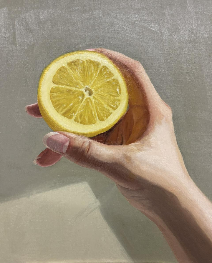 F10号(652×530) 「身近なもの」をテーマに制作 手の凹凸や皮膚、果実の質感、強い光によって生まれるコントラストなど、モチーフをよく観察し、細部まで丁寧に仕上げました。