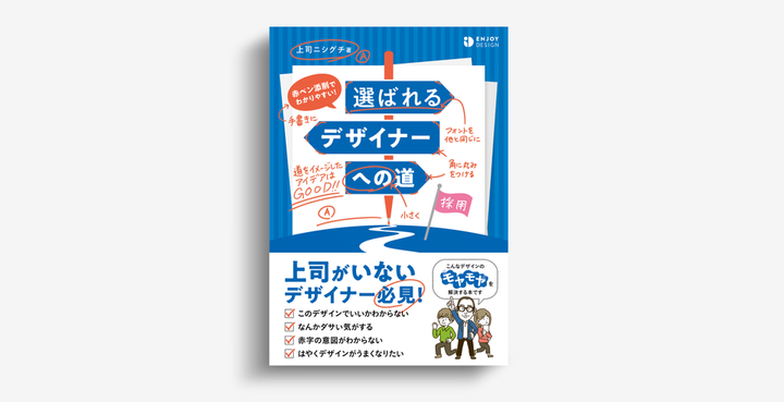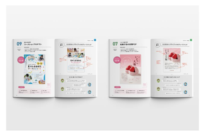 駆け出しデザイナー向けにクライアントの意図を読み解くアドバイスやデザイン的な改善ポイントを、上司と部下の会話でわかりやすく解説した本のデザイン作例を一部担当しました。