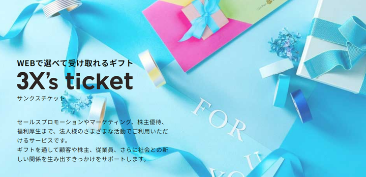 ■ 法人向けサービス『3X’s ticket(サンクスチケット)』 カスタマイズ性が高く、あらゆるシーンに対応可能な法人向けギフトサービスです。 「多くのお客様にノベルティをお渡ししたい」 「株主優待の効率化を図りたい」 「個人情報の管理コストを削減したい」 法人ならではのニーズに全力でお応えしております。