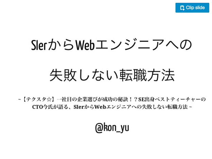 【テクスタ☆】一社目の企業選びが成功の秘訣!?SE出身ベストティーチャーのCTO今氏が語る、SIerからWebエンジニアへの失敗しない転職方法 https://tech-studio.doorkeeper.jp/events/29672 登壇時の発表資料 はてブが250ぐらいついた