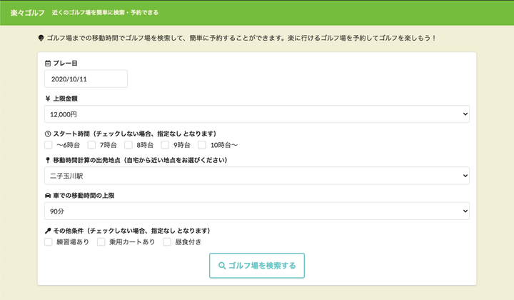 移動時間で絞り込めるゴルフ場検索サービスです。フロントはReact、バックエンドはAWS Lambdaのサーバレスの構成になっています。(GitHubリポジトリ)フロント:https://github.com/ysk1180/golf-course-search-front 、バックエンド:https://github.com/ysk1180/lambda-golf-course-search