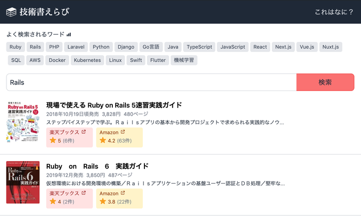 楽天ブックスとAmazonの両方のレビューを見ながら技術書を選べるサービスです。フロントはVue3のSPA、バックエンドはRails APIモードの構成になっています。(GitHubリポジトリ)フロント:https://github.com/ysk1180/choise-book-vue 、バックエンド:https://github.com/ysk1180/choise-book