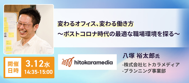 【セミナー概要】 オフィス回帰が進む中、「従業員が働きがいを感じ、"出社したくなる"オフィスにしたいけれど、何から手をつければいいのか分からない」——そんな悩みを抱える企業が増えています。 本セッションでは、単なる移転やリニューアルではなく、社員を巻き込んだオフィスづくりによってエンゲージメントを高める方法を解説します。 また、レイアウト変更や一部の内装リニューアルなど、オフィス移転をせずに職場の雰囲気を変える具体的な事例を紹介。 オフィスが組織づくりや採用にも与える影響を踏まえ、どの企業でも実践できるアイデアをお伝えします。 働く人が「自分ごと」として関われるオフィスづくりのヒントを見つけてみませんか? 【こんな人におすすめ】 ・これからのオフィスについて、どうしていけば良いのか悩んでいる管理部門の方 ・働き方や働く場を変えていきたいと考えている企業の管理部門の方 ・採用に力を入れていきたい企業の管理部門の方 ・チーム力を強めていきたい企業の管理部門の方