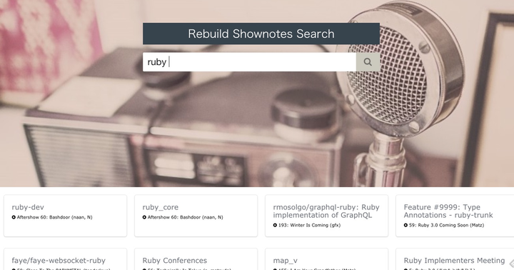 Rebuild.fm のエピソードを検索することのできるサービス。 キーワードを入力することで、そのワードが話題に挙がったエピソードを抽出します。