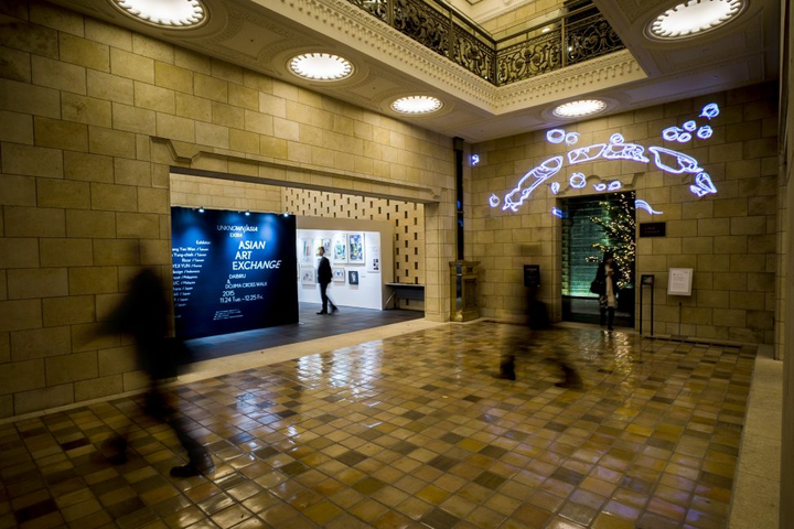 レーザープロジェクションマッピングによって、明るいオフィスビルのエントランスでも「土地の歴史を彷彿させるアート」という要件をクリアした作品