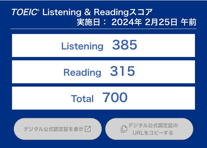 700点を目標に苦手分野のリスニングや文法に力を入れて勉強し、目標達成いたしました。 地道に努力する力を手に入れました 次の試験では800点を目標にしております。 最終目標は900点を超えることです。