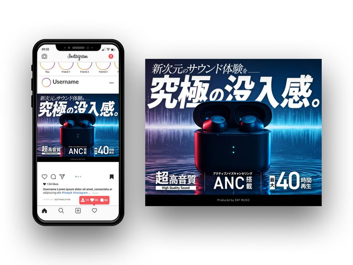 ■ 概要 自主制作として、ワイヤレスイヤホンの広告バナーを作成しました。 SNSやECサイトで配信することを想定しています。 ■ クライアント名 DAY MUSIC ■ 種類 Web広告バナー(EC/SNS向け商品訴求) ■ 目的・ゴール ・「究極の没入感」という体験価値を前面に押し出し、ブランドの存在感を強調する。 ・ノイズキャンセリングや再生時間など、購買を後押しする機能を簡潔に伝える。 ・SNSやECの一覧表示で目立ち、クリックや購入につなげる。 ■ ターゲット ・音楽・映像にこだわり、没入感のある体験を求める20〜40代男女。 ・通勤・通学やワークアウトなど、日常的に長時間イヤホンを使用する層。 ■ コンセプト 圧倒的な没入感を“体験”として伝えるため、ブルーの世界観と水面の波紋で臨場感を演出。 ■ デザイン意図 ・キャッチコピー:「究極の没入感」を大きく配置し、ユーザーに強烈な印象を与える。 ・ビジュアル:水面の波紋やブルーの光で「音が広がる感覚」と「幻想的な没入感」を視覚化。 ・カラー:深いネイビーと鮮やかなブルーを基調に、テクノロジー感と高級感を演出。 ・タイポグラフィ:スペック情報(超高音質/ANC搭載/最大40時間再生)をアイコン的に整理し、ひと目で理解できる構成に。
