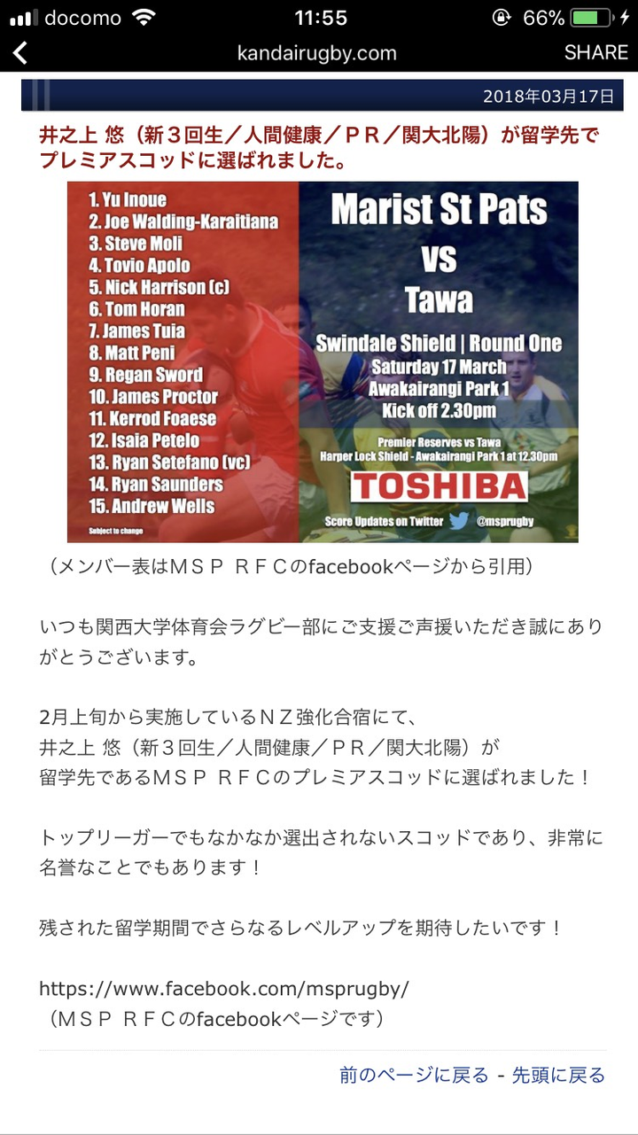 ラグビー部に所属。 4年次ではポジションリーダーに就任。 昨年度1部リーグから2部リーグへ降格するも自身が最終学年の時に昇格。 個人としてはNZラグビー留学を経験。現地リーグチーム(100人程度)で日本人初スターティングメンバーに選出