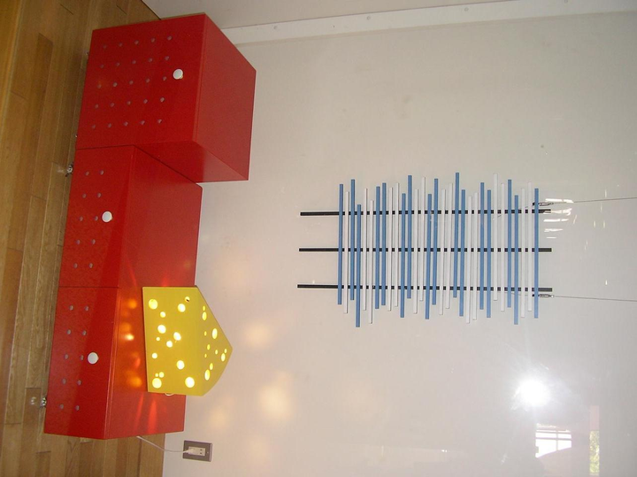チーズ型の証明とPOPな赤色の棚、壁に掛けてあるのは空をモチーフにしたCDラックになります!