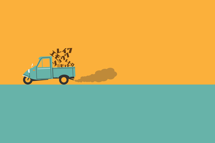 昨今のレトロブームに準えた作品です。一度は見たことがあるであろう三輪トラックが、レトロに関する言葉を積んで走っていく様子をシンプルなイラストで表現致しました。