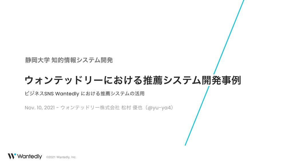2021年11月10日 の静岡大学の知的情報システム開発という講義における講演資料です。 ウォンテッドリーではなぜ推薦システムを活用しているのか、どのように開発しているのか、具体的にどんな価値を提供しているのか、企業における推薦システム開発とは、などについて私の経験に基づいてお話しました。 推薦システムを題材に上げてはいますが、一般的な問題解決の方法の話になっていたりもします。