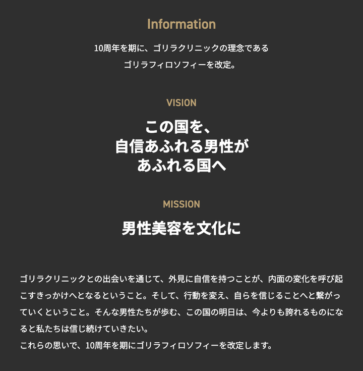 10周年を期に、ゴリラクリニックの理念であるゴリラフィロソフィーを改定するプロジェクトを担当。現在のステージに合わせたVISIONの言語化とMISSIONのリライティングを行いました。