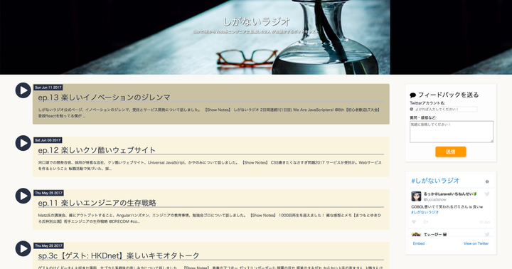 友人と2人で公開しているPodcast「楽しくて仕方がないラジオ」の公式Web Page。 React以外のWEB FWを学びたいということから学習し、FirebaseとSoundcloud APIを用いてサーバーレスで構築。