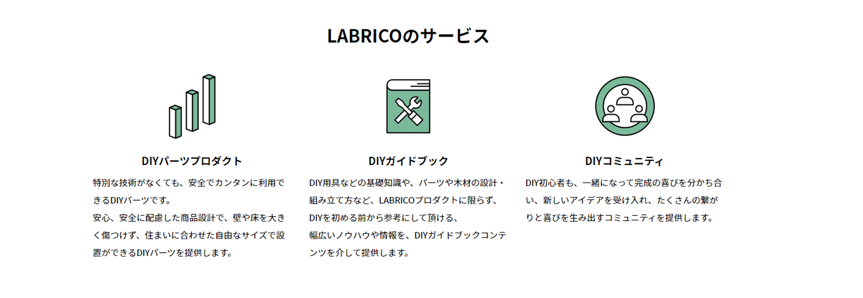 「LABRICO(ラブリコ)」は、「『くらしを変える』をカンタンに」というコンセプトのDIYブランドです。DIYを経験したことがない方から、経験豊富な方まで、多くの方がより気軽に安心してDIYに取り組めるよう、手軽で使いやすいDIYパーツやDIYに関するサービスを企画・開発しています。自分の暮らしたい形や生活スタイルの変化に合わせて、住まいのDIYを楽しむ人たちを応援しています。