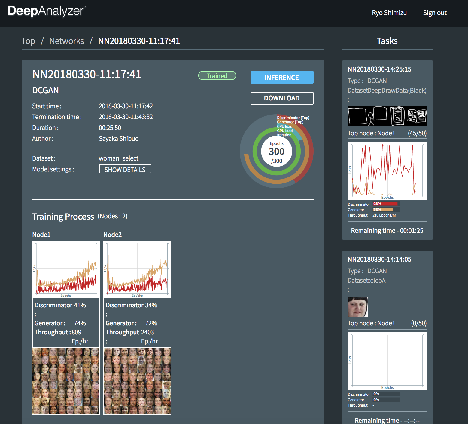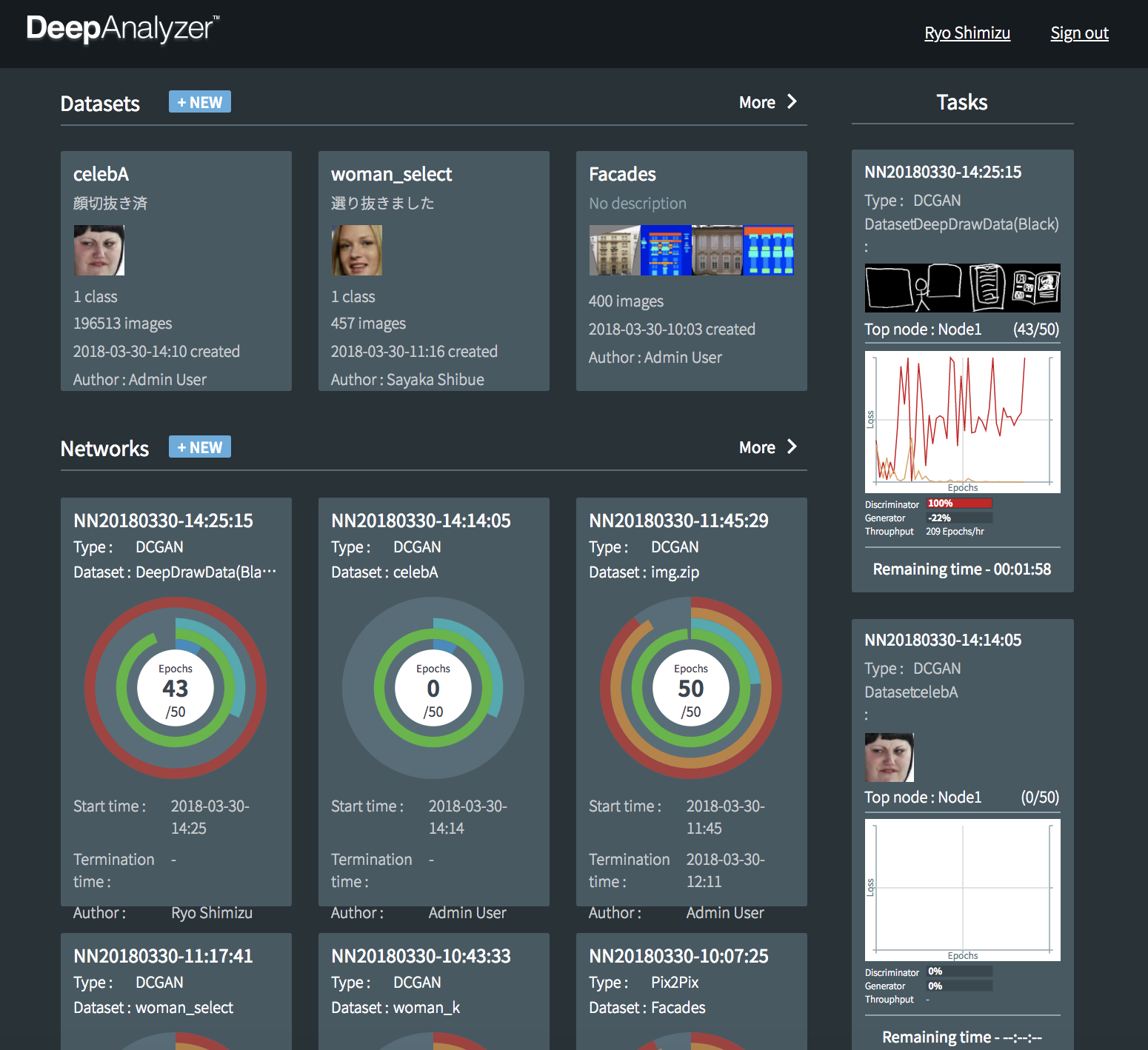 画像分類、画像生成、教師なし学習などをサポートした、世界で最も多機能な(※2018年4月当社調べ)GUIベースの統合学習環境。