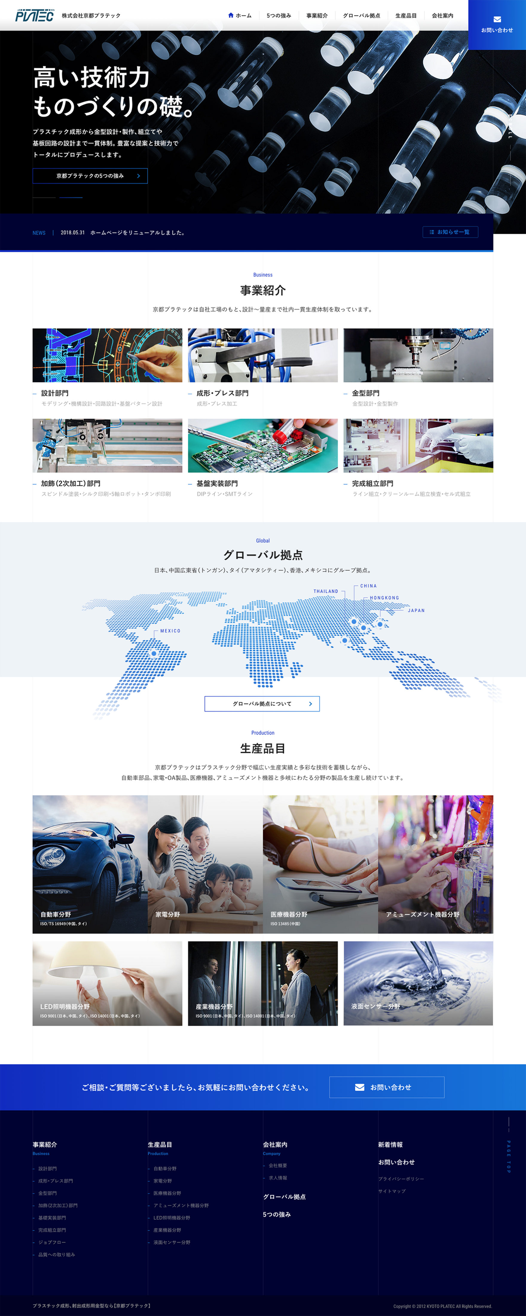 設計から社内一貫体制で行う「ものづくりのトータルプロデュースメーカー」であり、「グローバル拠点を持つ」ことを強みとしてアピール。先進性・緻密さを印象付けるデザインで、生産を主軸とした「ものづくりメーカー」のイメージから脱却するサイト設計を目指しました。