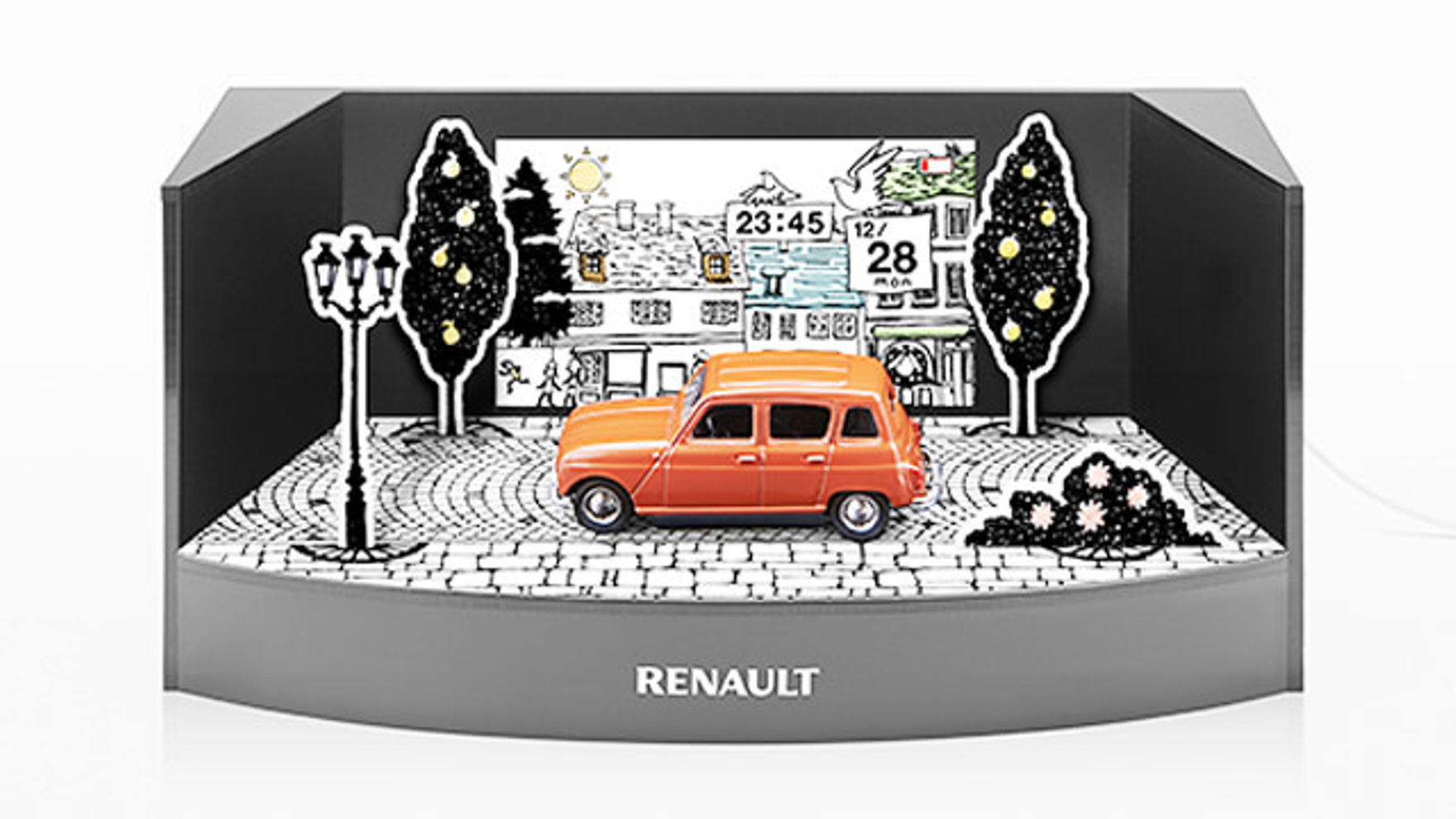 その2015年度版としてカレンダーアプリを制作しました。プレゼントとして配布された専用のジオラマキットに iPhone を設置。充電ケーブルに接続するとコンテンツが始まり、ジオラマ中央に配置されたミニカーがフランスの街をドライブしているかのような演出を生み出します。
