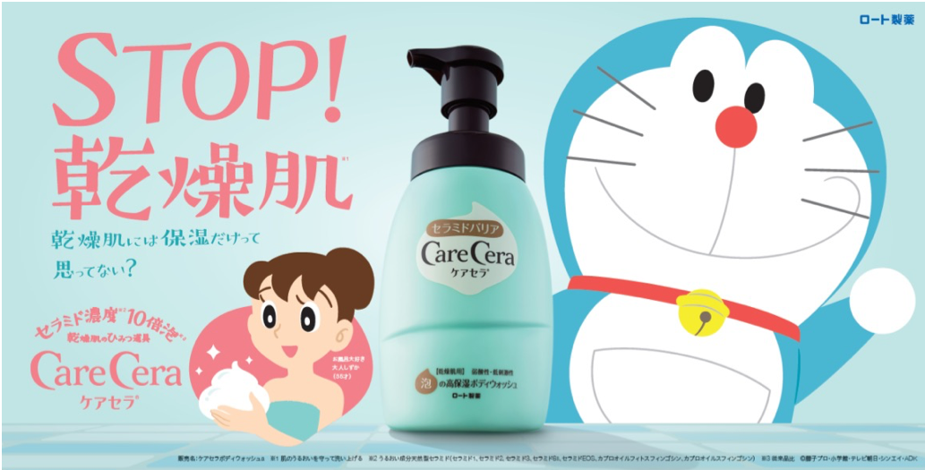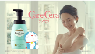 <STORY> 乾燥肌用ボディソープ「ケアセラ」の広告プロモーションを担当。 「洗う乾燥肌対策」というコンセプトのもと、お風呂に入りすぎて乾燥肌になっているターゲットの象徴としてしずかちゃんを、ケアセラをひみつ道具として薦める宣伝塔としてドラえもんを起用し、CM中心のコミュニケーションで新規顧客獲得に貢献しました。