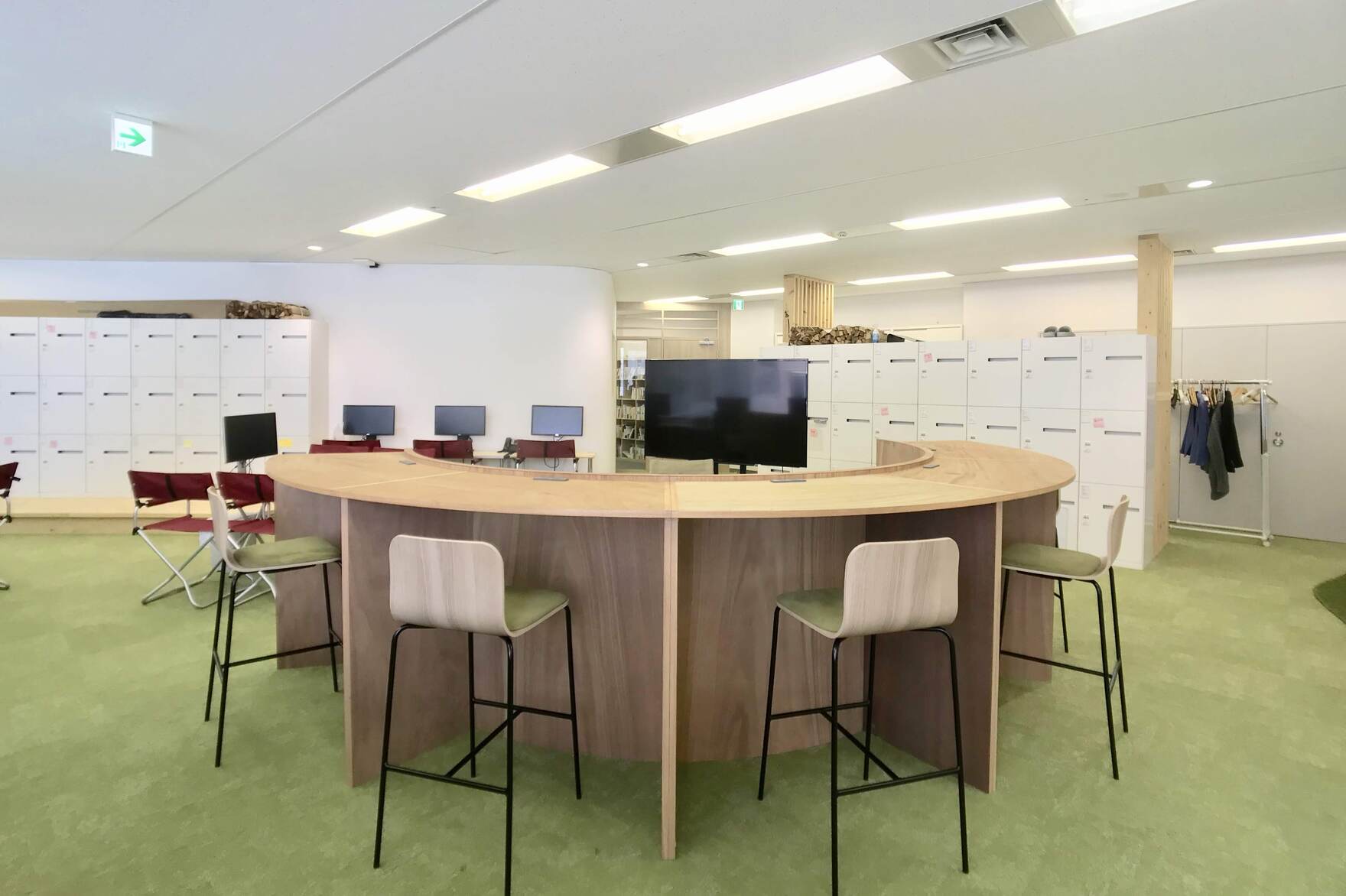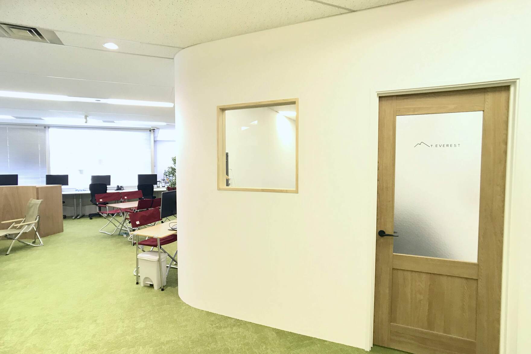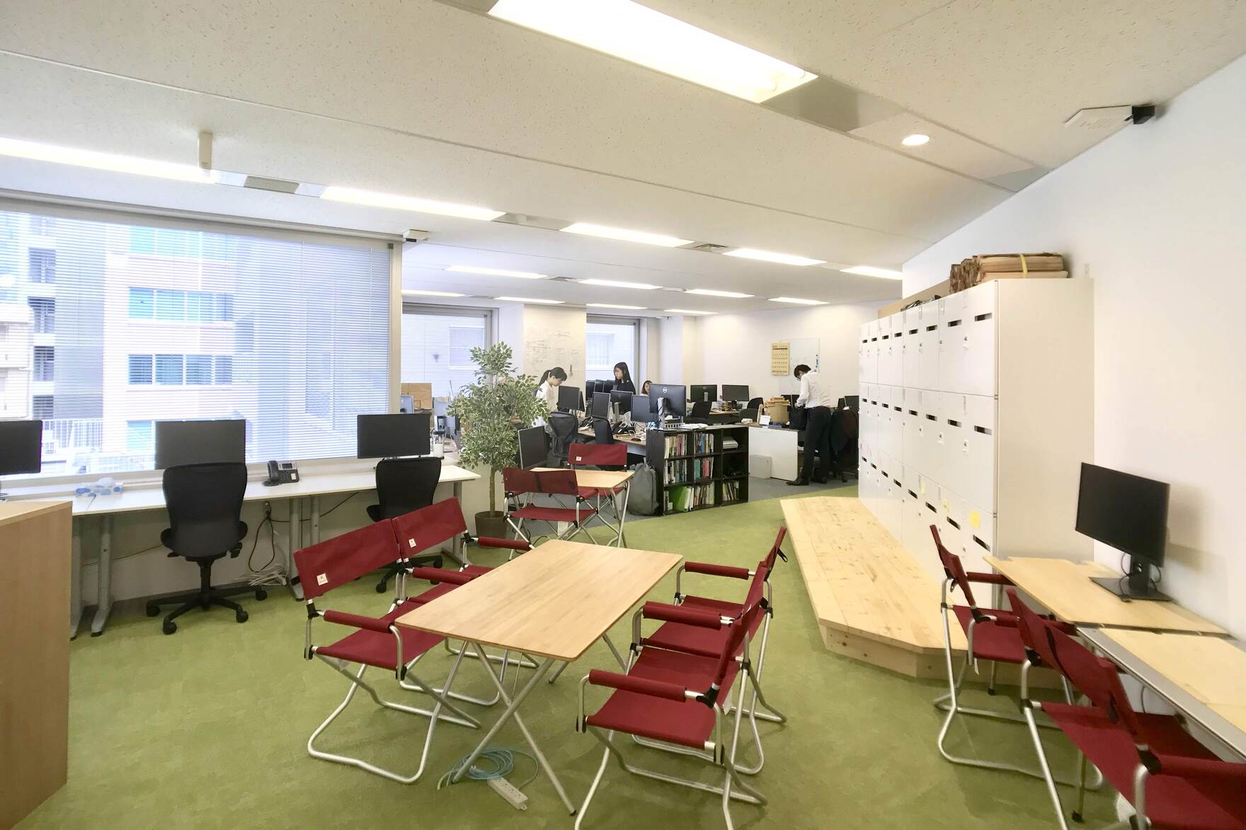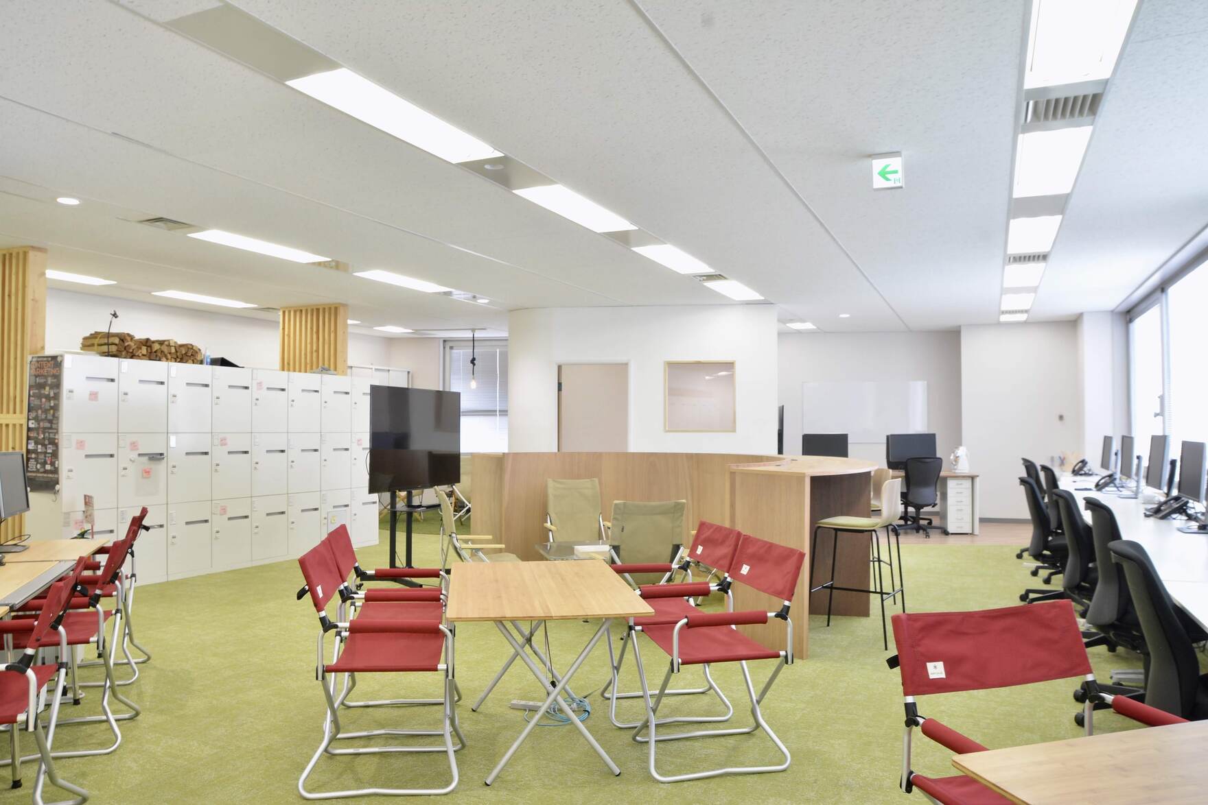 また、キャンプ用品とオフィス家具の目線の高さの違いを利用し、空間全体の広がりを演出。しっかりとオフィス機能を担保しつつ、適度にカジュアルな雰囲気を持った空間を設計した。