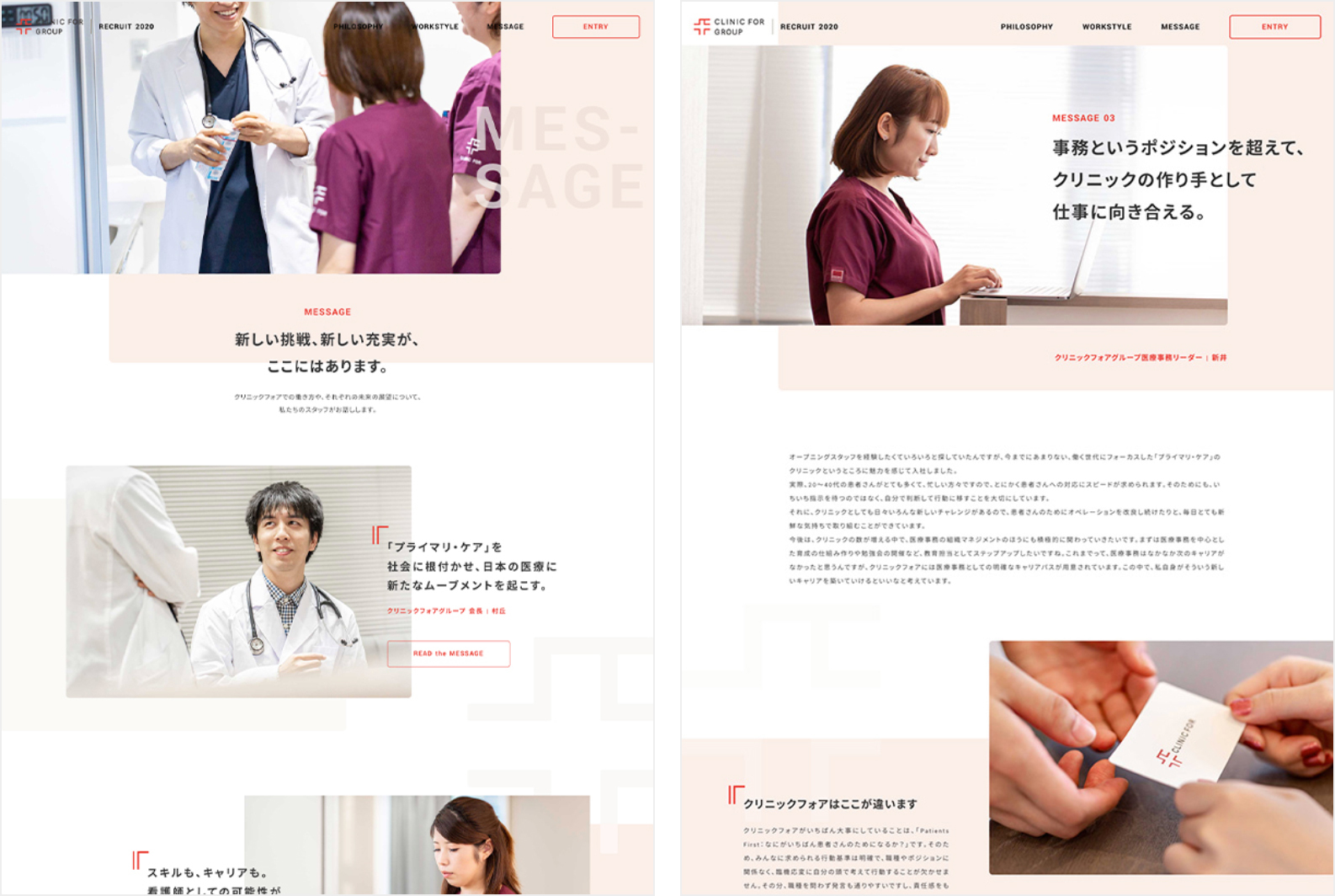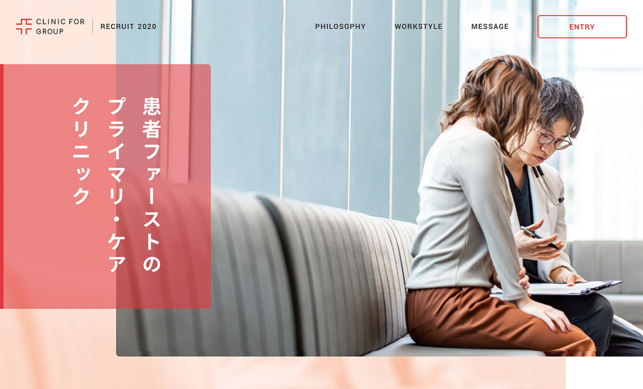 「クリニックフォアグループ」は、次世代の患者ファーストを目指し「プライマリ・ケア」を実践するクリニックです。ハイライツでは、そのリクルートサイトのアートディレクション、デザイン、撮影ディレクションを担当しました。「医療の、原点へ。医療の、未来へ。」というスローガンの元、患者ファーストという安心感と新しいクリニックを目指すという先進性とを兼ねそなえたデザインを意識しました。