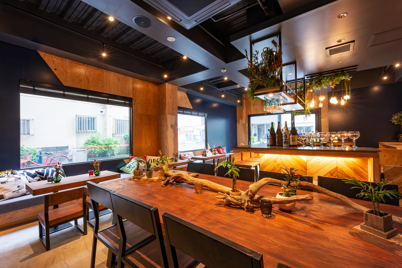 1Fは観葉植物などを使用し自然あふれる憩いの空間に仕上げております。小物ひとつから細部にまでこだわりを持って空間演出をプロデュースしました。また、壁面には、FOCUSをイメージしたアートウォールも展示されており、圧巻な世界観をご覧いただけます。