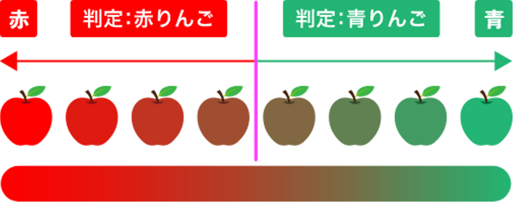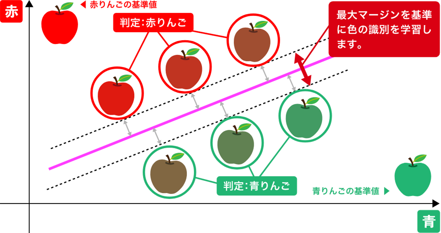 赤リンゴのデータ周りの領域と青りんごの周りの領域とが距離が最大化されるよう基準を設けることで、それぞれのクラスの未学習の類似の問いに対する正しい答えを導く能力が低くならないようにする手法です。