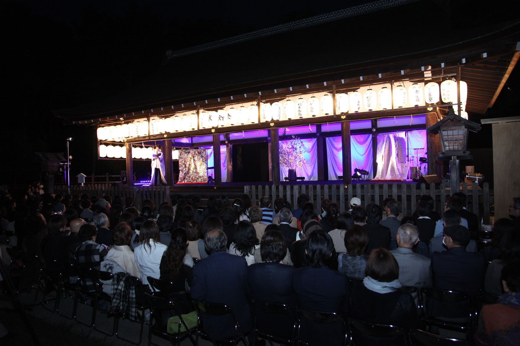 上賀茂神社の式年遷宮1周年イベント元宝ジェンヌと弊社の衣裳で神社の成り立ちをストーリーにファッションショーを行いました。結婚式の文化や着物の素晴らしさを伝えるため神社氏子や公募で募集した新郎新婦に参加してもらい花嫁行列からスタート、壮大なストーリーで行いました。