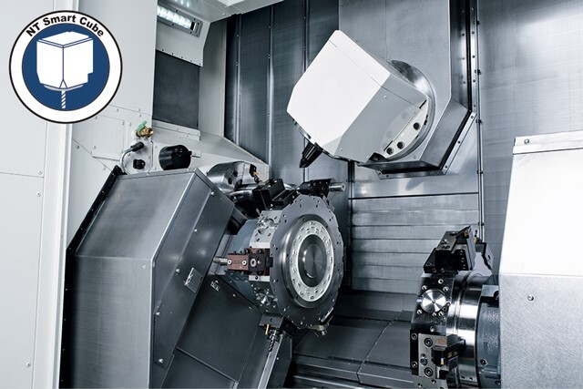 主軸端面間距離1,850mmと幅広い加工をエリアに加え、世界最小ATC工具主軸「NT Smart Cube」搭載