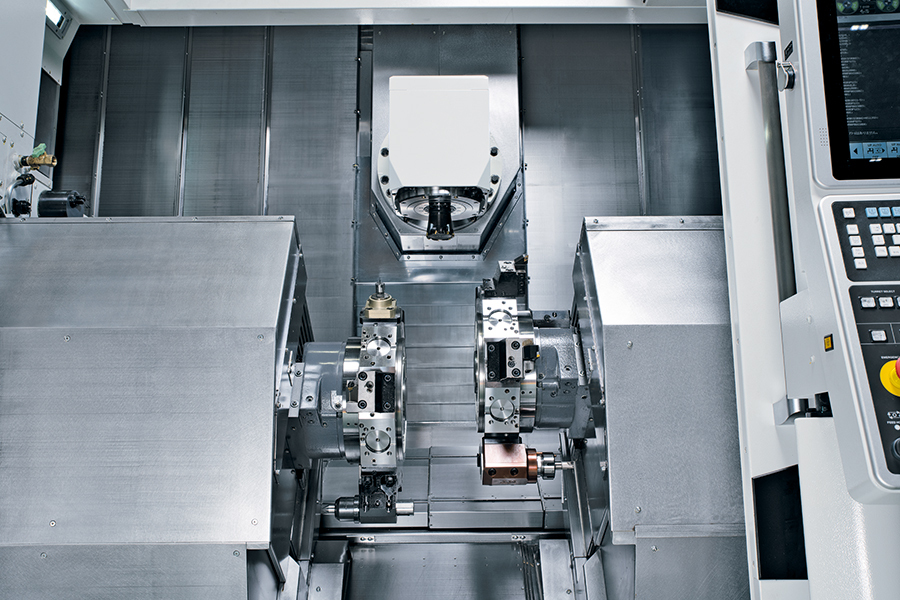 対向2スピンドルによるL/R同時加工はもちろん、ロアタレットはシングルタレットとダブルタレットを選択可能なモジュール設計となっています。