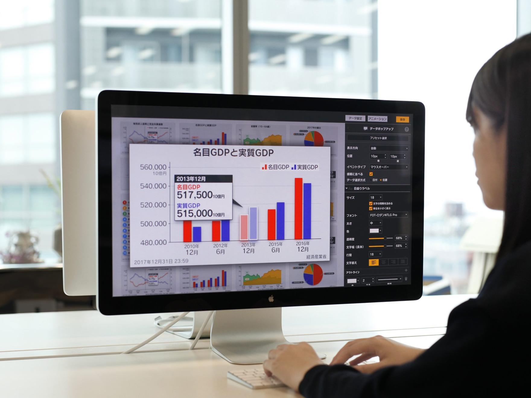 全国に支局をもつ大手放送局で利用されているデータ分析プラットフォーム。取材内容や通信社配信の情報、オープンデータなど、あらゆるデータを瞬時に呼び出し、分析から放送までを一環して作業できるスキーム&ツールの開発をしています。アプリケーションによってデザインされたグラフビジュアルは、ニュースの種となり、報道番組やウェブサイトなど様々な場面で、データジャーナリズムを支えています。